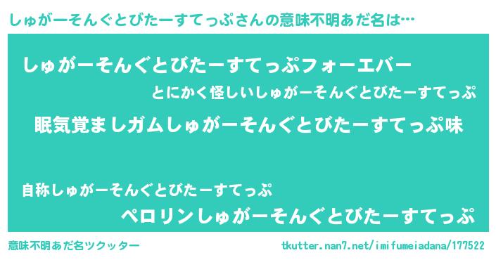 | ヒーロー風カッコイイあだ名 | 『慈愛の使者しゅがーそんぐとびたーすてっぷ』 |