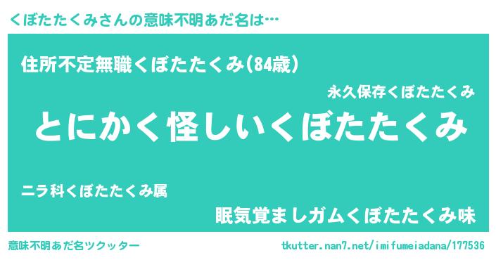 | 胡散臭い通販商品みたいなあだ名 | 『信頼と実績のサプリメント…その名も「くぼたたくみ」』 |