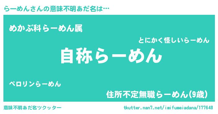 | 男性向けラノベタイトル風あだ名 | 『らーめんに滅ぼされるだけの簡単なお仕事です』 |