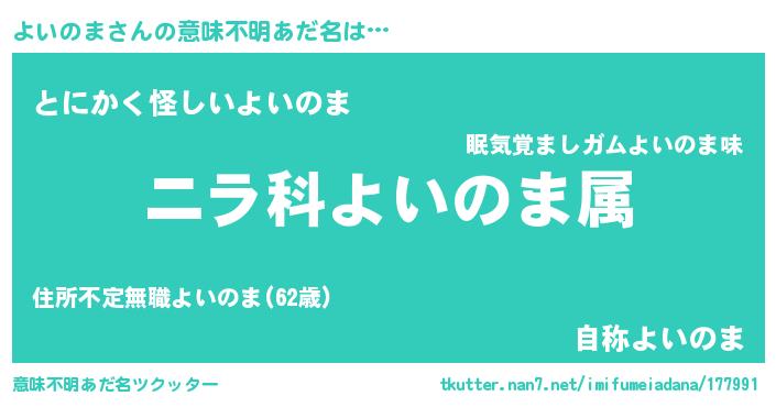 | 男性向けラノベタイトル風あだ名 | 『よいのま~年齢イコール彼女いない歴の魔法使い~』 |