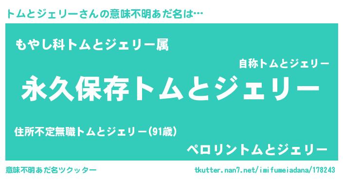 | 男性向けラノベタイトル風あだ名 | 『トムとジェリーという概念が存在しない退屈な世界 』 |