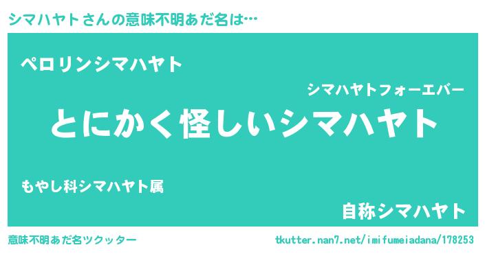| 男性向けラノベタイトル風あだ名 | 『ダンジョンにシマハヤトを求めるのは間違っているだろうか』 |