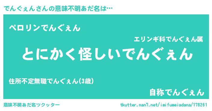 | 男性向けラノベタイトル風あだ名 | 『でんぐぇんの嫁は女の子じゃないと思った?』 |