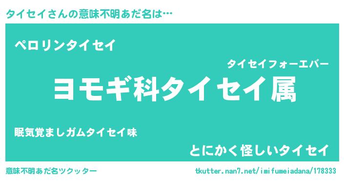 | 男性向けラノベタイトル風あだ名 | 『タイセイ~年齢イコール彼女いない歴の魔法使い~』 |