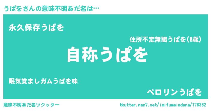 | 男性向けラノベタイトル風あだ名 | 『Re:うぱをから始める異世界生活』 |