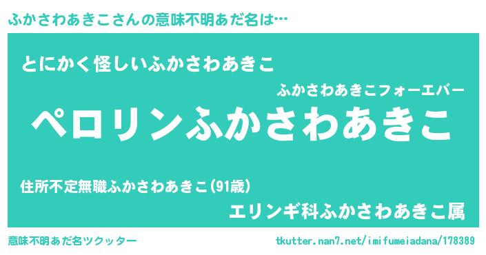 | 胡散臭い通販商品みたいなあだ名 | 『億万長者になれるブレスレット…その名も「ふかさわあきこ」』 |