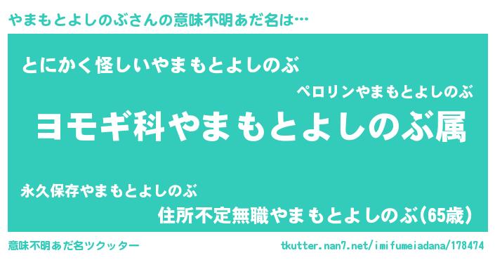 | 男性向けラノベタイトル風あだ名 | 『やまもとよしのぶ~年齢イコール彼女いない歴の魔法使い~』 |