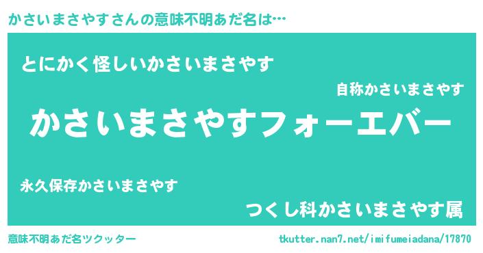 | 男性向けラノベタイトル風あだ名 | 『はたらくかさいまさやすさま!』 |