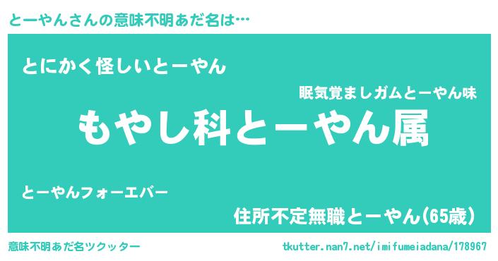 | 男性向けラノベタイトル風あだ名 | 『転生したらとーやんだった件』 |
