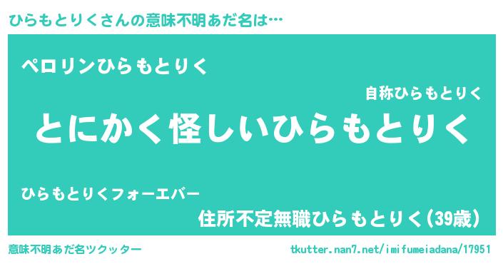 | 胡散臭い通販商品みたいなあだ名 | 『信頼と実績のサプリメント…その名も「ひらもとりく」』 |