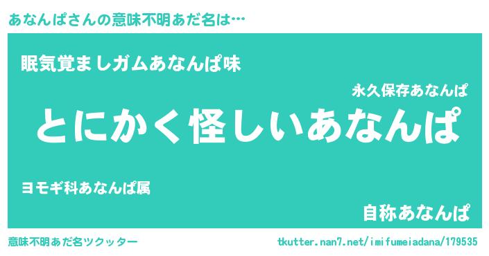 | 男性向けラノベタイトル風あだ名 | 『あなんぱの嫁は女の子じゃないと思った?』 |