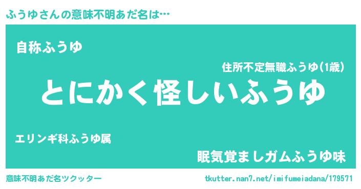 | 男性向けラノベタイトル風あだ名 | 『ふうゆに滅ぼされるだけの簡単なお仕事です』 |