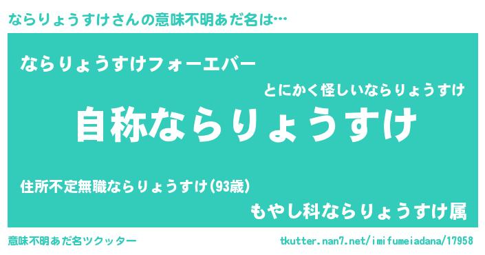 | 男性向けラノベタイトル風あだ名 | 『Re:ならりょうすけから始める異世界生活』 |