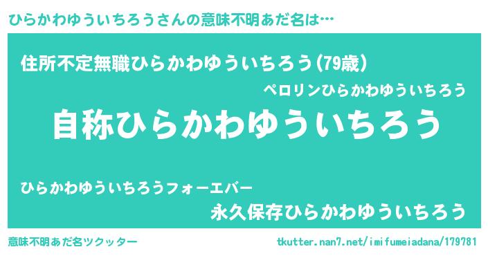 | 男性向けラノベタイトル風あだ名 | 『Re:ひらかわゆういちろうから始める異世界生活』 |
