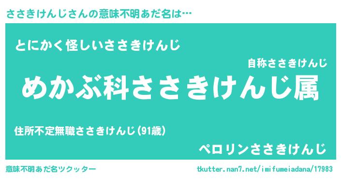 | 男性向けラノベタイトル風あだ名 | 『ササキケンジスレイヤー』 |