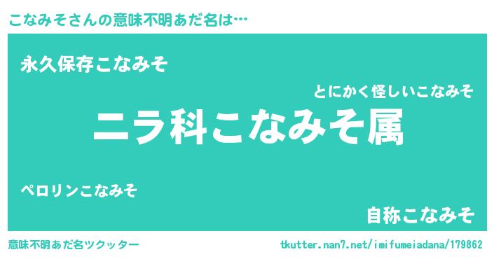 | 男性向けラノベタイトル風あだ名 | 『こなみそ~年齢イコール彼女いない歴の魔法使い~』 |