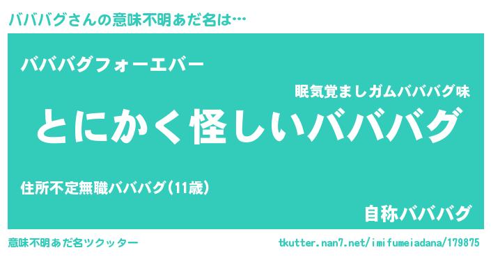| 男性向けラノベタイトル風あだ名 | 『バババグの嫁は女の子じゃないと思った?』 |
