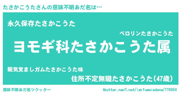 | 男性向けラノベタイトル風あだ名 | 『たさかこうた~年齢イコール彼女いない歴の魔法使い~』 |