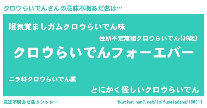 | 欧米人風あだ名 | 『クロウらいでんクリステル』 |