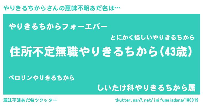 | 男性向けラノベタイトル風あだ名 | 『やりきるちからに滅ぼされるだけの簡単なお仕事です』 |