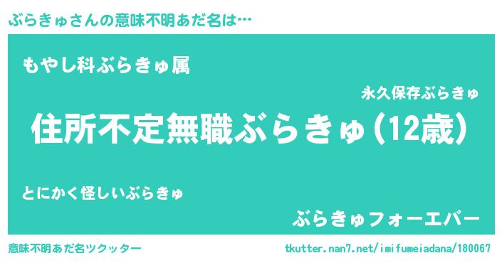 | 男性向けラノベタイトル風あだ名 | 『ぶらきゅに滅ぼされるだけの簡単なお仕事です』 |