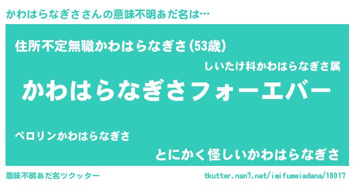 | 男性向けラノベタイトル風あだ名 | 『やはりかわはらなぎさの青春ラブコメはまちがっている 』 |