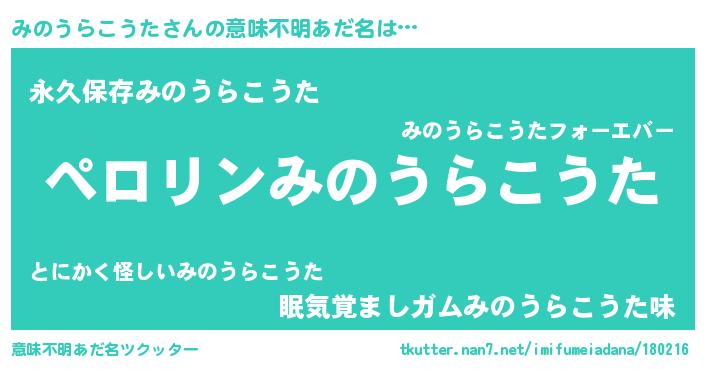 | 男性向けラノベタイトル風あだ名 | 『うちのみのうらこうたが世界を掌握している!』 |