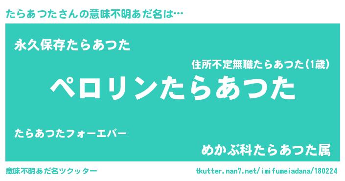| 男性向けラノベタイトル風あだ名 | 『たらあつたの憂鬱』 |