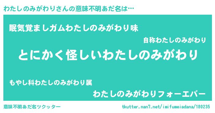 | ポケモン風あだ名 | 『ワタゴンZ』『ヒワタシノミガワリ』 |