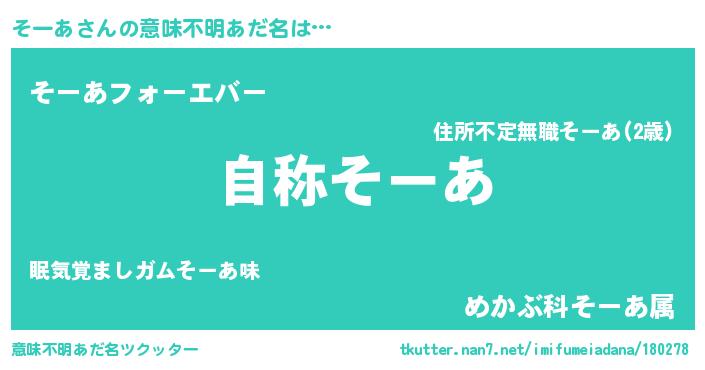 | 男性向けラノベタイトル風あだ名 | 『Re:そーあから始める異世界生活』 |