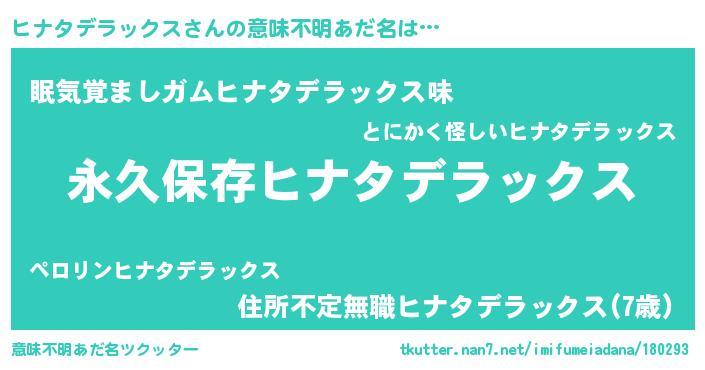 | 胡散臭い通販商品みたいなあだ名 | 『来世でも幸せになれる健康食品…その名も「ヒナタデラックス」』 |