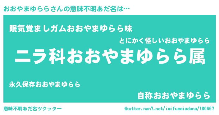 | 男性向けラノベタイトル風あだ名 | 『おおやまゆらら~年齢イコール彼女いない歴の魔法使い~』 |