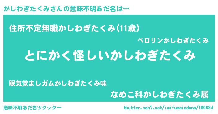 | 女子向けラノベタイトル風あだ名 | 『かしわぎたくみ様がみてる』 |
