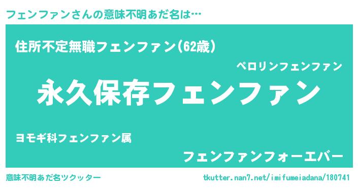 | 男性向けラノベタイトル風あだ名 | 『フェンファンという概念が存在しない退屈な世界 』 |
