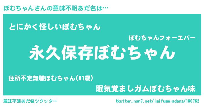 | 男性向けラノベタイトル風あだ名 | 『ぼむちゃんという概念が存在しない退屈な世界 』 |