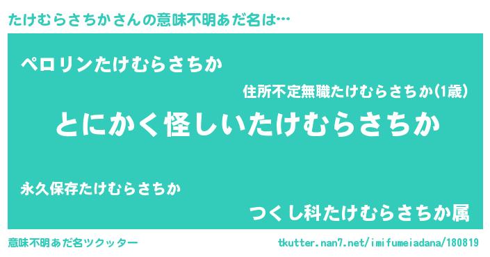 | 男性向けラノベタイトル風あだ名 | 『たけむらさちかの嫁は女の子じゃないと思った?』 |