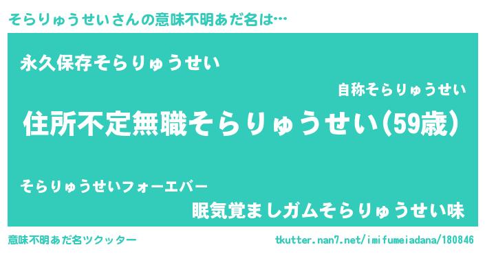 | 男性向けラノベタイトル風あだ名 | 『この素晴らしい世界にそらりゅうせいを!』 |