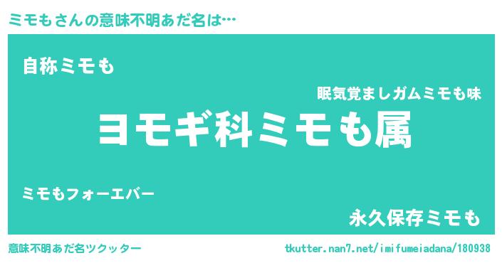 | 男性向けラノベタイトル風あだ名 | 『ミモも~年齢イコール彼女いない歴の魔法使い~』 |