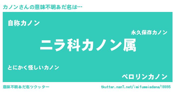 | 男性向けラノベタイトル風あだ名 | 『カノン~年齢イコール彼女いない歴の魔法使い~』 |