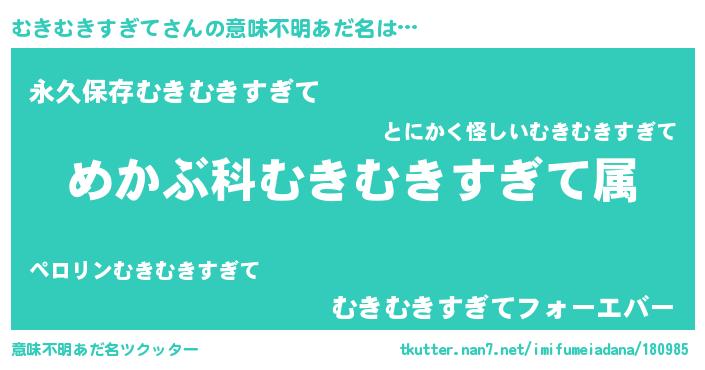 | 胡散臭い通販商品みたいなあだ名 | 『絶対に幸福をもたらす水素水…その名も「むきむきすぎて」』 |