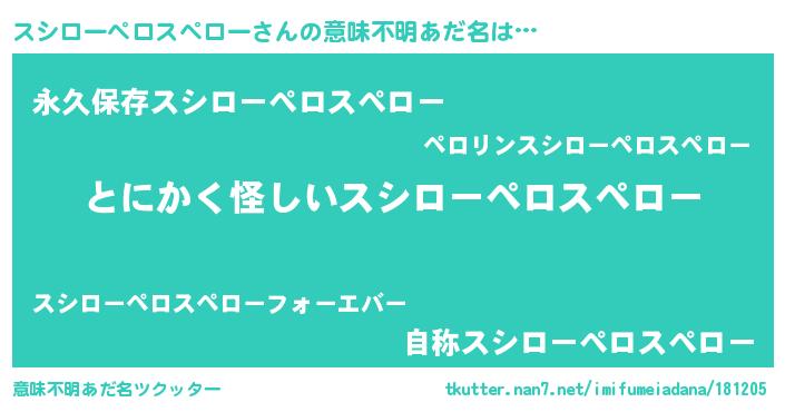 | 男性向けラノベタイトル風あだ名 | 『スシローペロスペローの嫁は女の子じゃないと思った?』 |