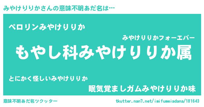 | 男性向けラノベタイトル風あだ名 | 『転生したらみやけりりかだった件』 |