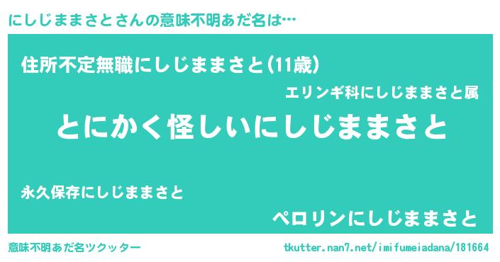| ポケモン風あだ名 | 『ヒニシジママサト』『ニシゴンZ』 |