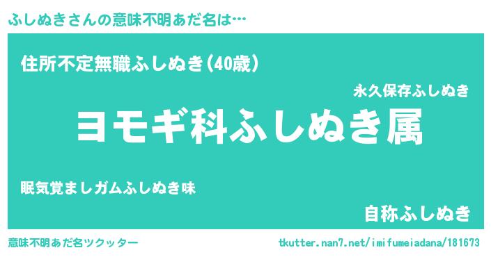 | 男性向けラノベタイトル風あだ名 | 『ふしぬき~年齢イコール彼女いない歴の魔法使い~』 |