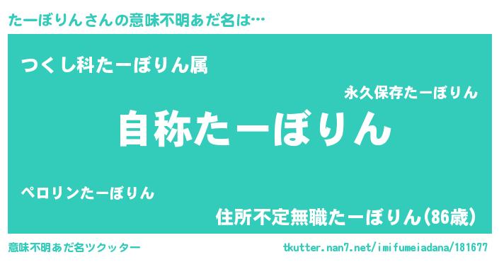| 男性向けラノベタイトル風あだ名 | 『Re:たーぼりんから始める異世界生活』 |