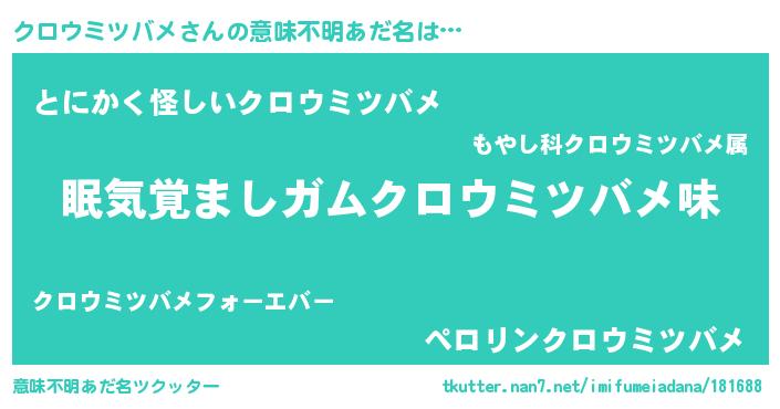 | 男性向けラノベタイトル風あだ名 | 『おまえをオタクにしてやるから、俺をクロウミツバメにしてくれ! 』 |