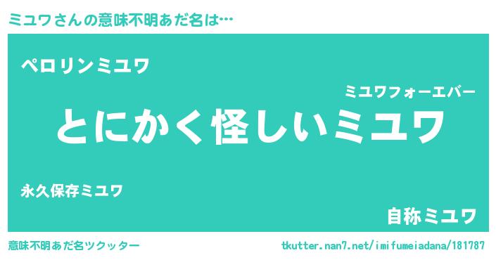 | 女子向けラノベタイトル風あだ名 | 『ミユワ様がみてる』『ミユワ伯爵の花嫁』 |
