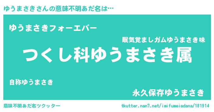 | 男性向けラノベタイトル風あだ名 | 『ゆうまさき~年齢イコール彼女いない歴の魔法使い~』 |