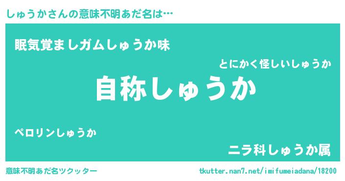 | 男性向けラノベタイトル風あだ名 | 『Re:しゅうかから始める異世界生活』 |