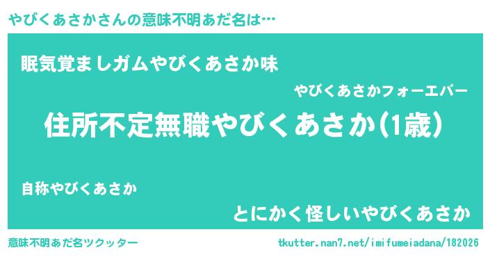 | 男性向けラノベタイトル風あだ名 | 『魔弾の王とやびくあさか』 |
